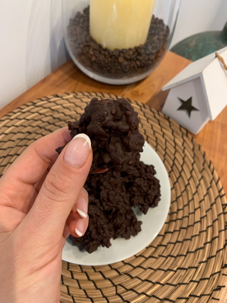 Prepara una bandeja con papel de horno y ve haciendo montoncitos con la mezcla que has hecho para formar las rocas. Deja que se enfríe completamente, si quieres en el frigorífico, y ya las tendrás lista para comer.